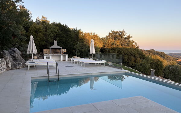 Draußen , von den wunderschön gepflasterten Patios, mit Sonnenliegen für alle Gäste ausgestattet kann man die eine sensationelle Aussicht und die Brise der Küste genießen . Ein Essbereich für die Gäste mit Grill steht für köstliche Mahlzeiten im Freien zur Verfügung. Der private Pool misst (7.5m x 5.7m, Tiefe 0.3m - 1.6m) und ist nachts wunderschön beleuchtet (Zugang zum Pool über die römische Treppe). Die Villa schützt , dank des cleveren design, die Privatsphäre der Gäste und ist der perfekte Ort, um ein erfrischendes Bad oder einen Drink zu genießen und der Sonnenuntergang im Meer zu bewundern.