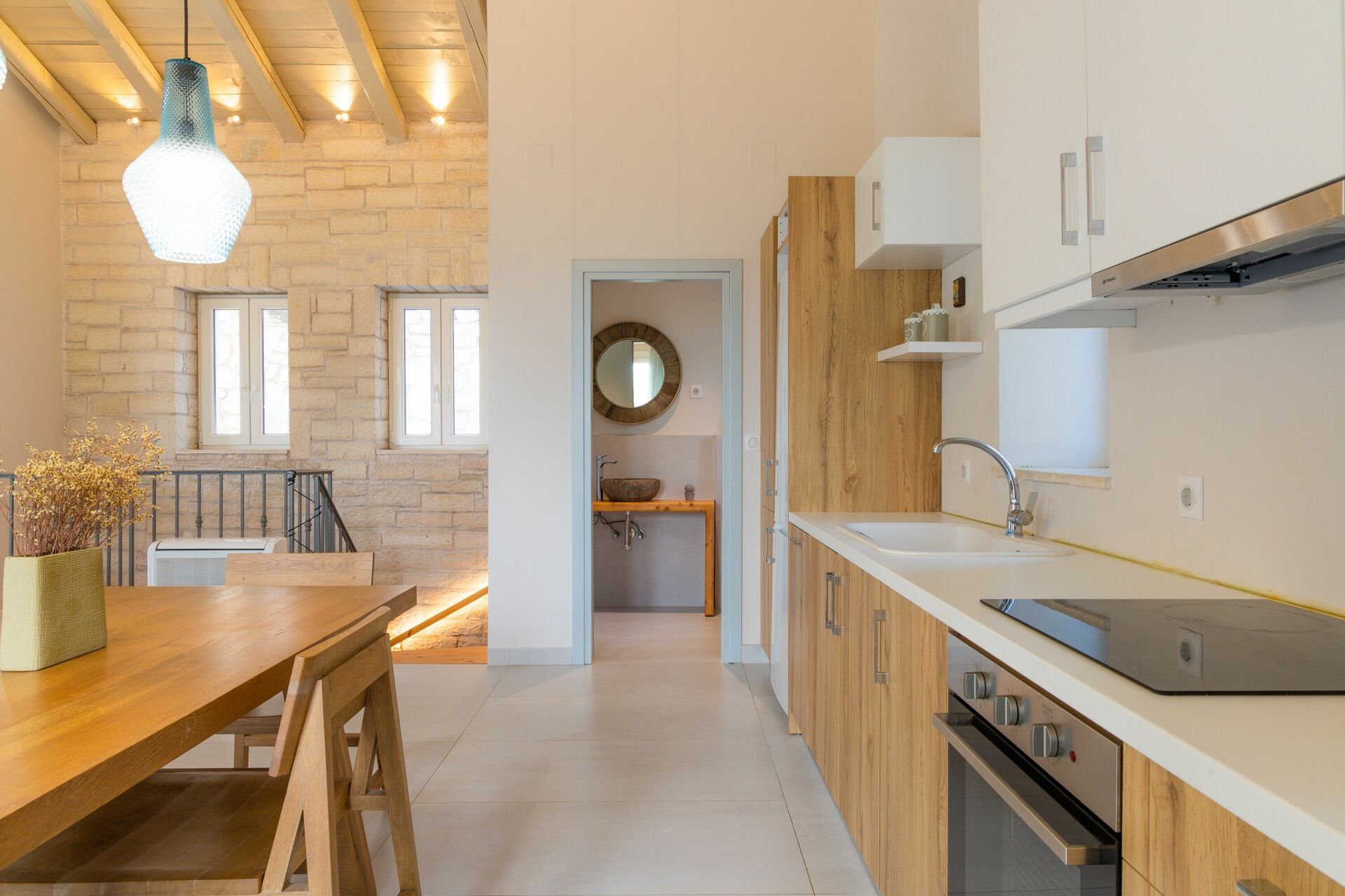 Premier étage: lumineuse partie jour composée de séjour, zone repas et cuisine (four, freezer, lave-vaisselle), bains de service (WC) avec lave-linge.