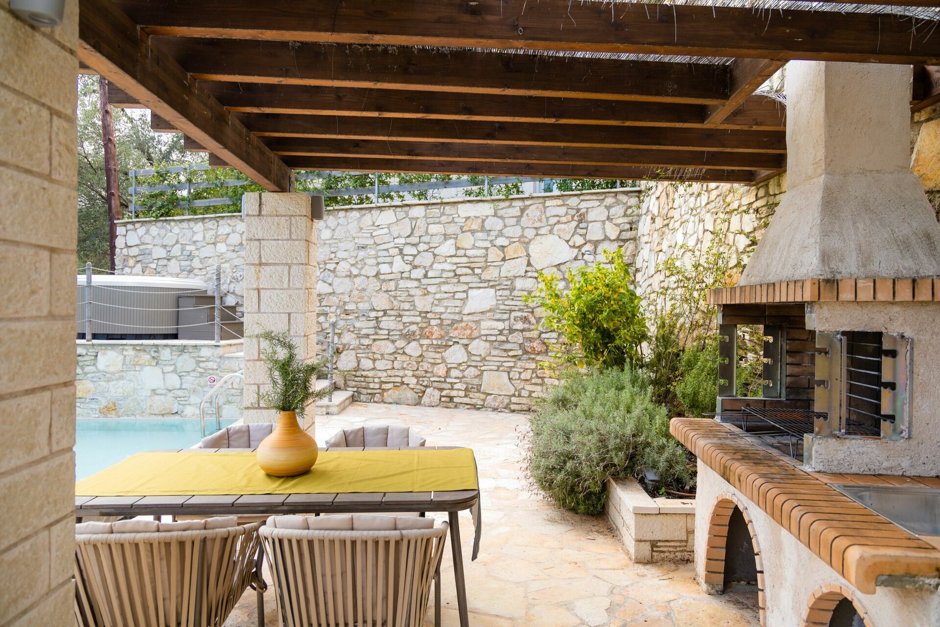 La villa peut accueillir jusqu'à 4 personnes dans 2 chambres et à l'extérieur, elle offre une piscine privée chauffée (qui fonctionne automatiquement lorsque la température descend en dessous de 24 degrés), un jacuzzi et un espace barbecue équipé d'un gazebo, d'une table et de chaises pour des repas confortables en plein air.
