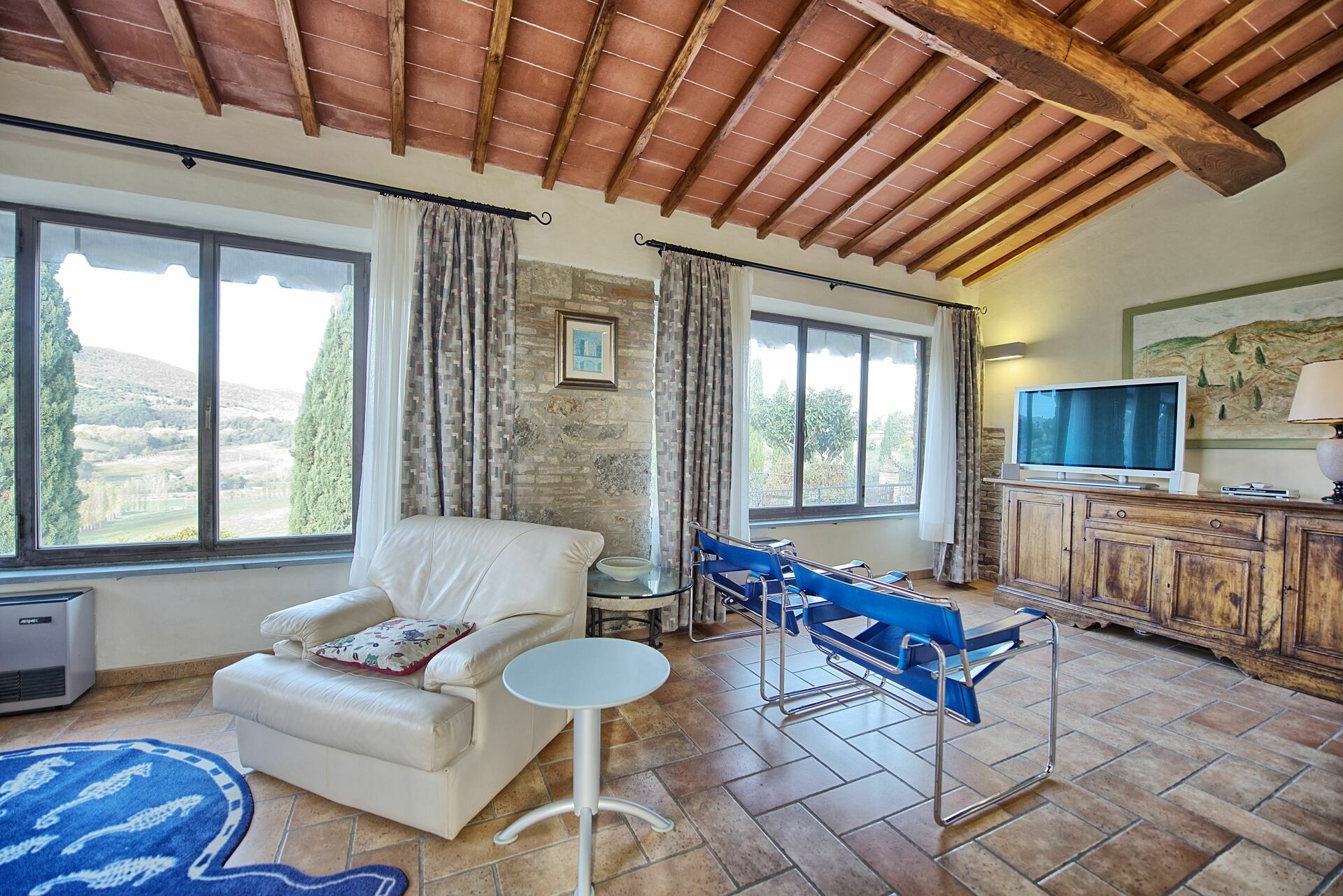 Ground floor apartment fully renovated in an old barn, including of a large kitchen with dining room, large living room with TV, 1 single sofà bed (€ 50 per week) and beautiful views of the countryside, double bedroom, 2 bathrooms with shower.