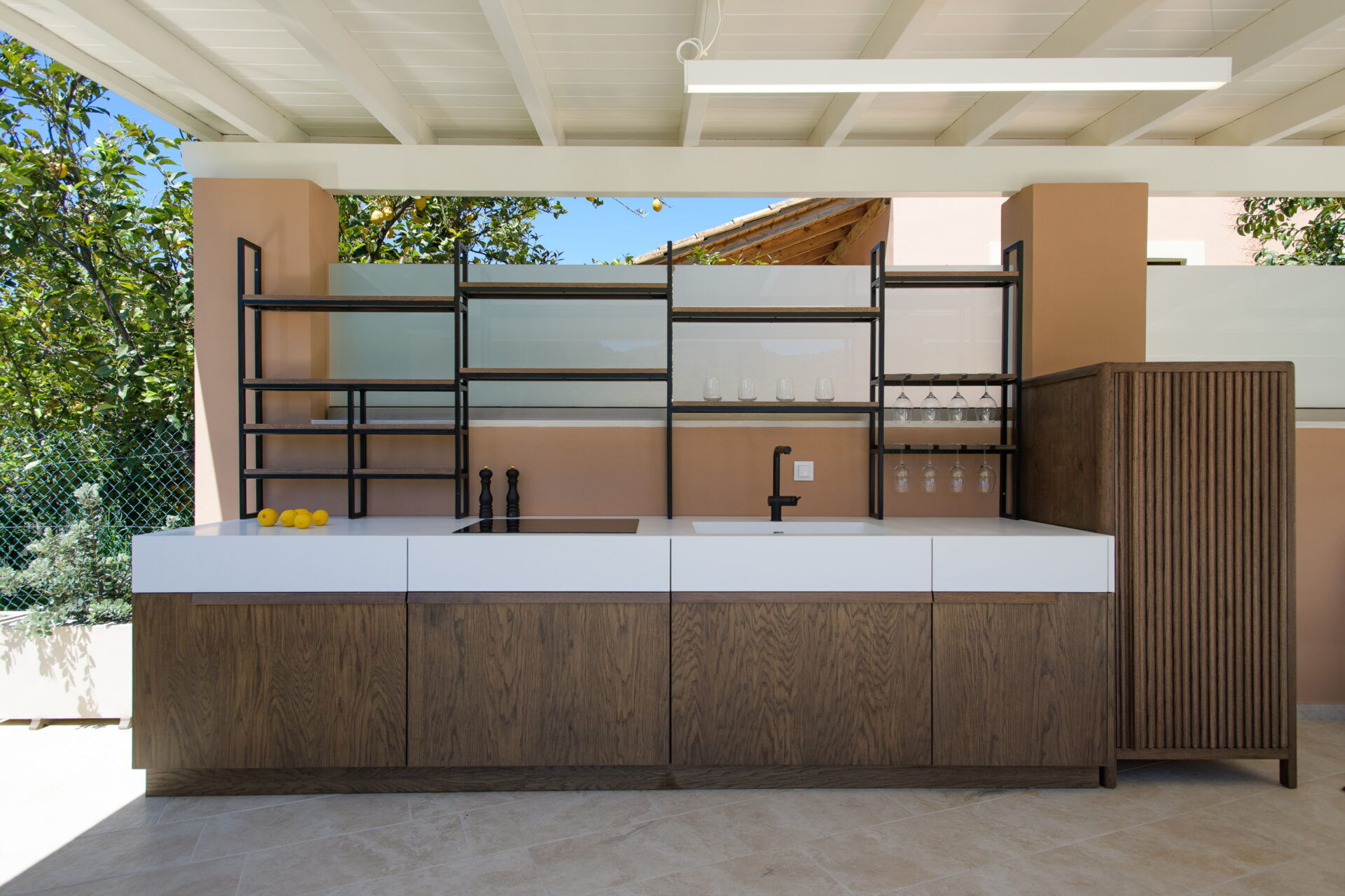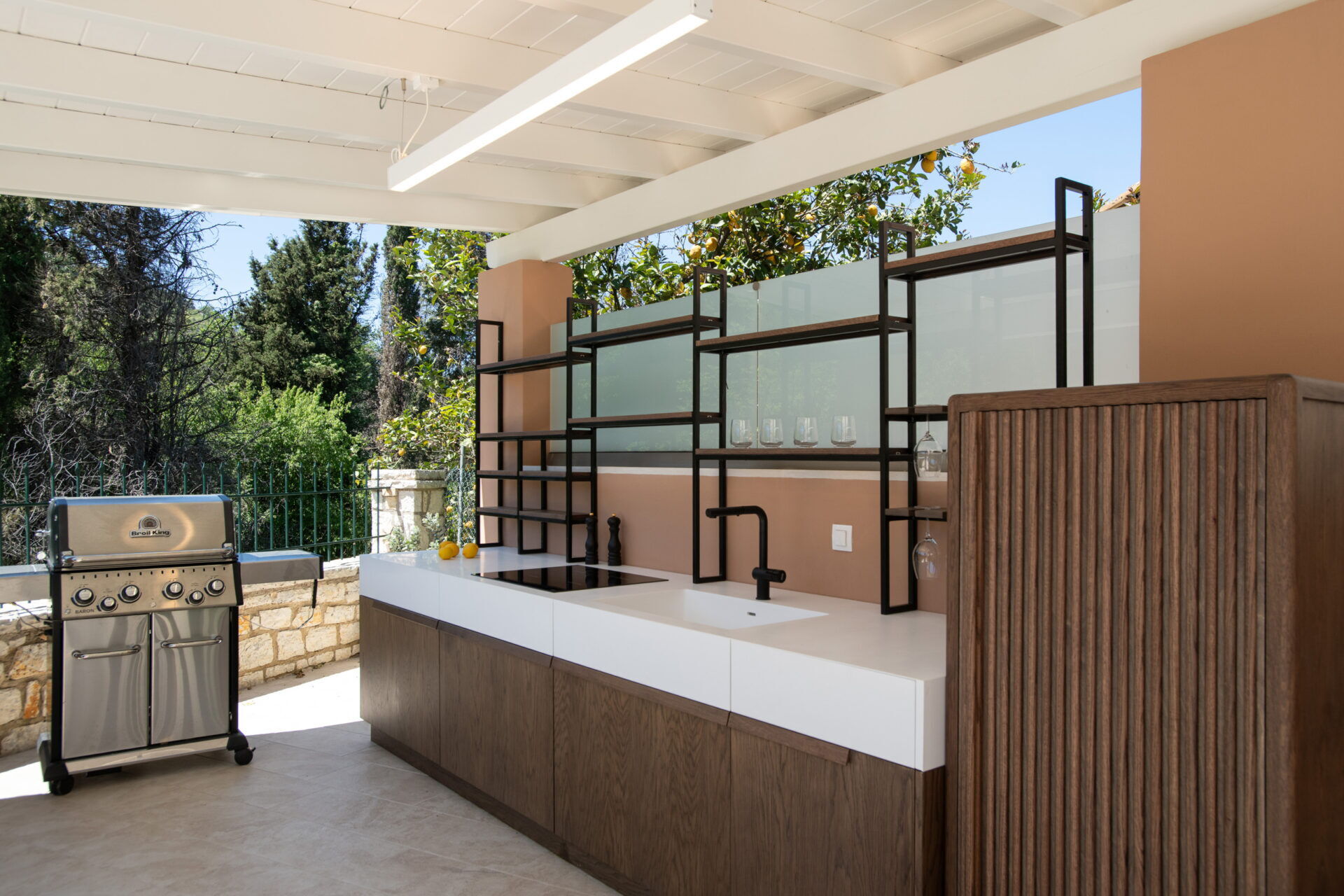 Villa Eleas Ikos features a large outdoor terraced area with an outdoor kitchen, barbecue and dining areaa. It also offers a lovely private pool.