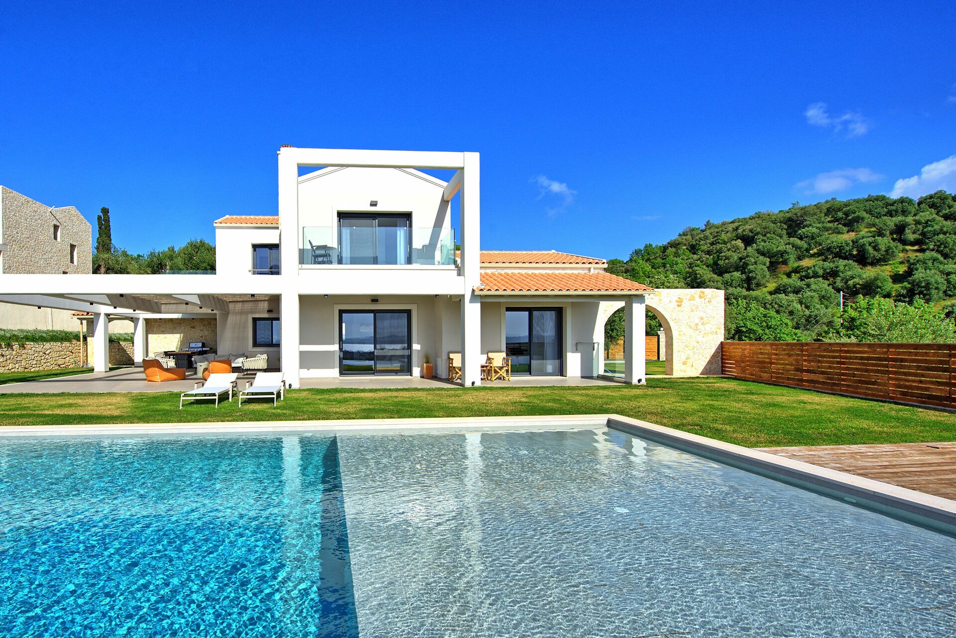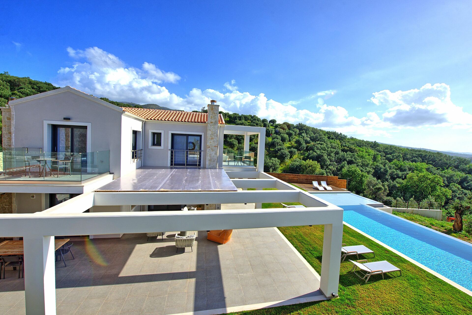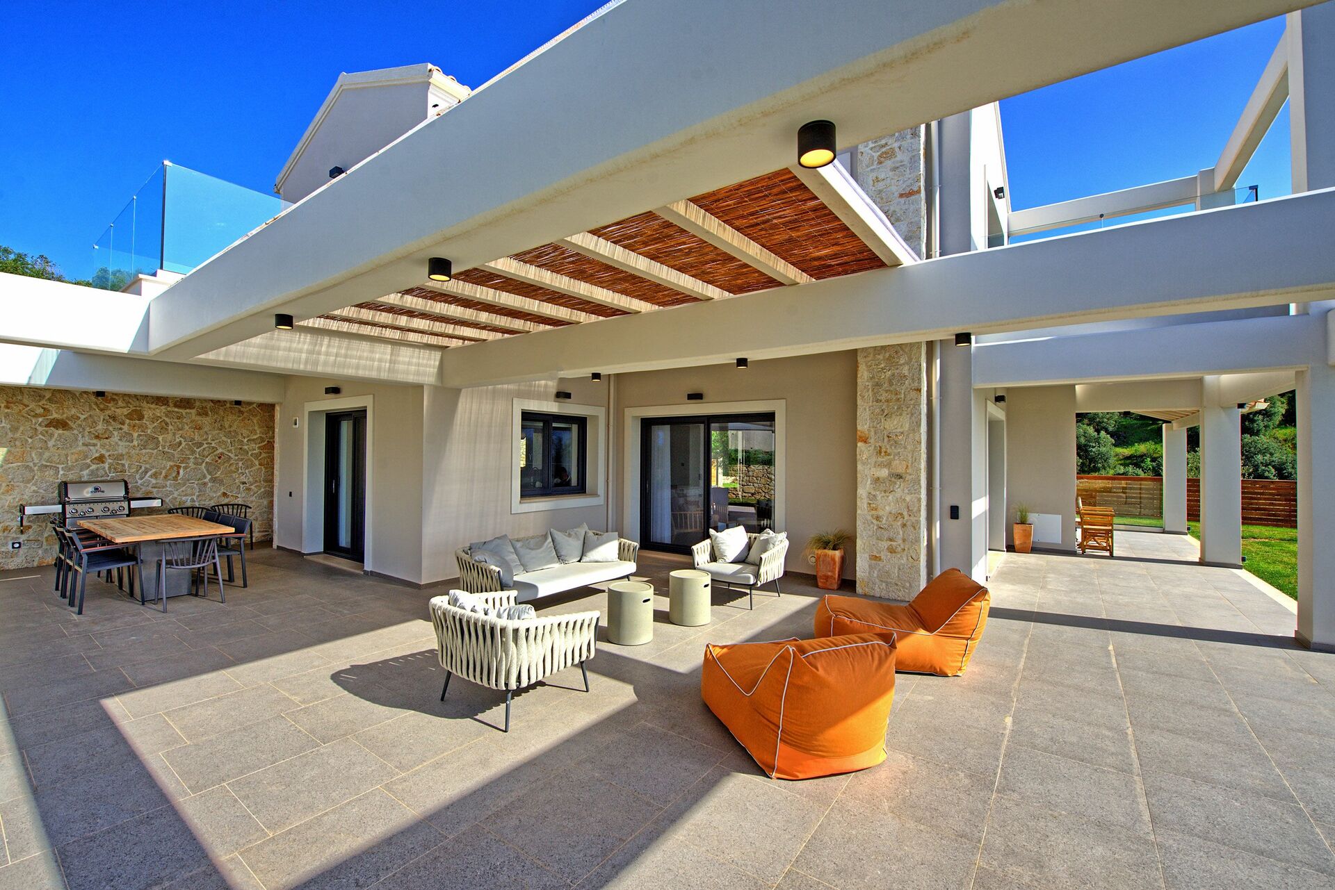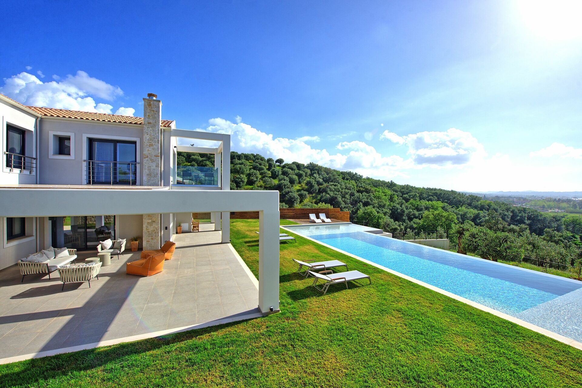 The house, unlike other villas we experienced in Corfu, was a modern masterpiece, with every detail being thought out. Electrical black out blinds keep the sun's brightness at bay in all 3 bedrooms, allowing you to wake at your own pace. AC so up-to-date and effective, it could be in a million dollar mansion in Miami. The house includes three en-suite double showers with great pressure, a full and modern kitchen, a large flat screen TV with HDMI plugin, open, light, indoor outdoor flow with screens on every window and door and a washer and dryer. We grilled on the BBQ, hung out on the bean bag chairs and outdoor dining table, and took constant dips in the pool as the sun beat down amidst the beautiful backdrop.