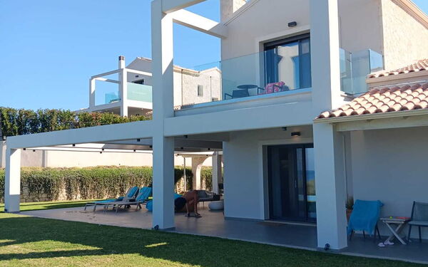 A beautiful, modern and spacious property perched on a hill with views from all the rooms overlooking the sea and the Albanian mountains in the distance.
