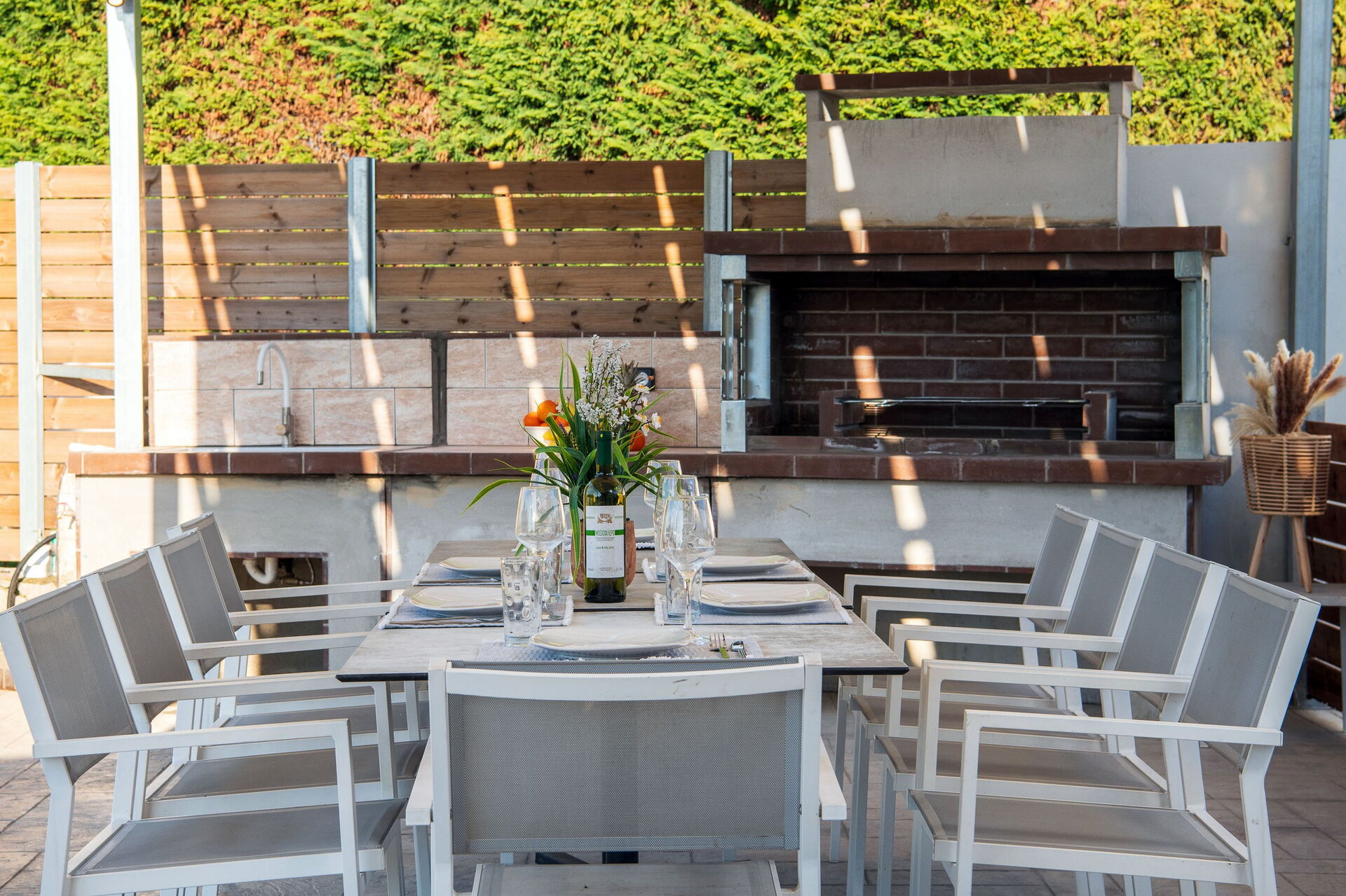 - möblerat uteområde med grill, bord och stolar för utomhusmåltider